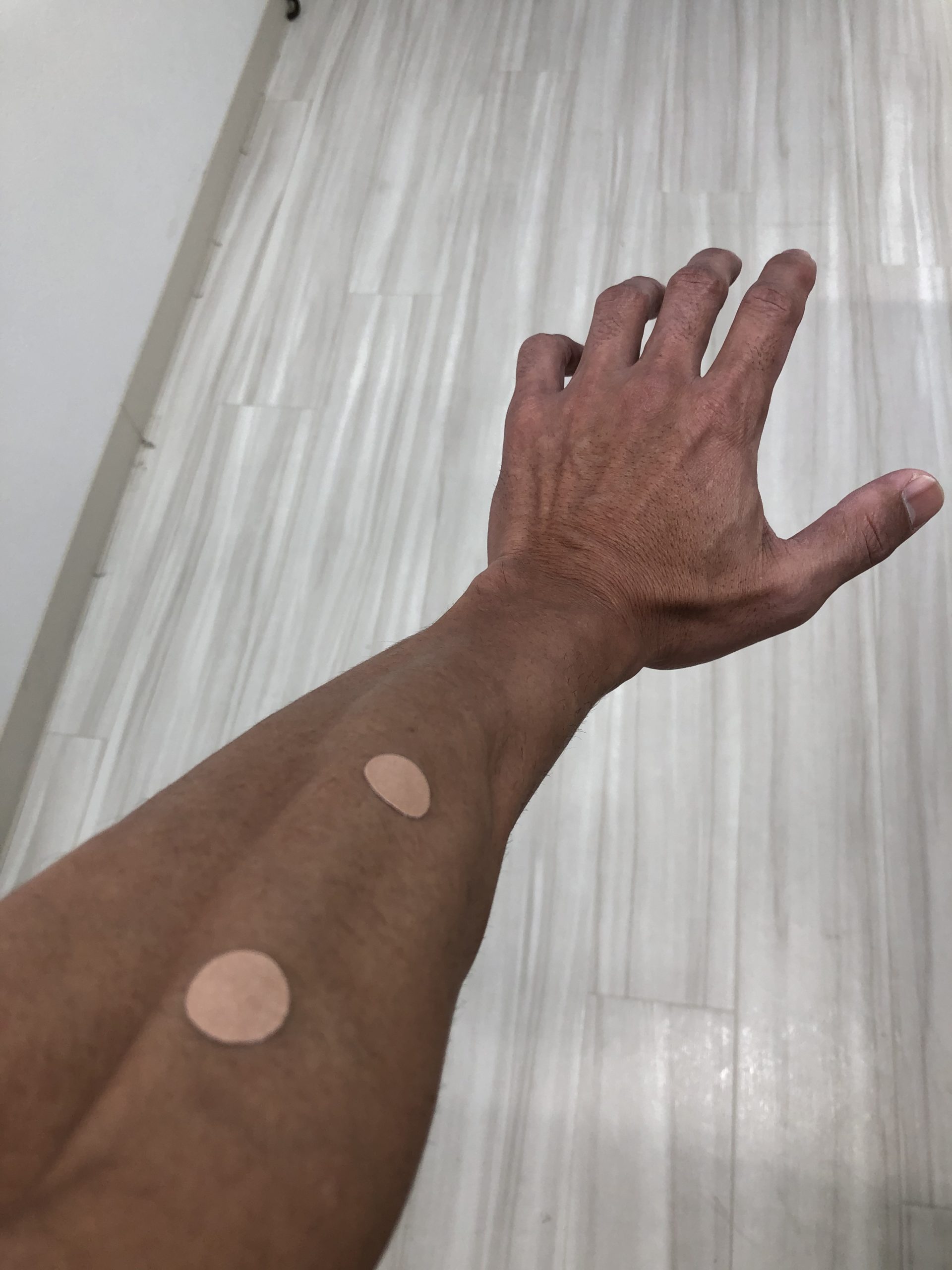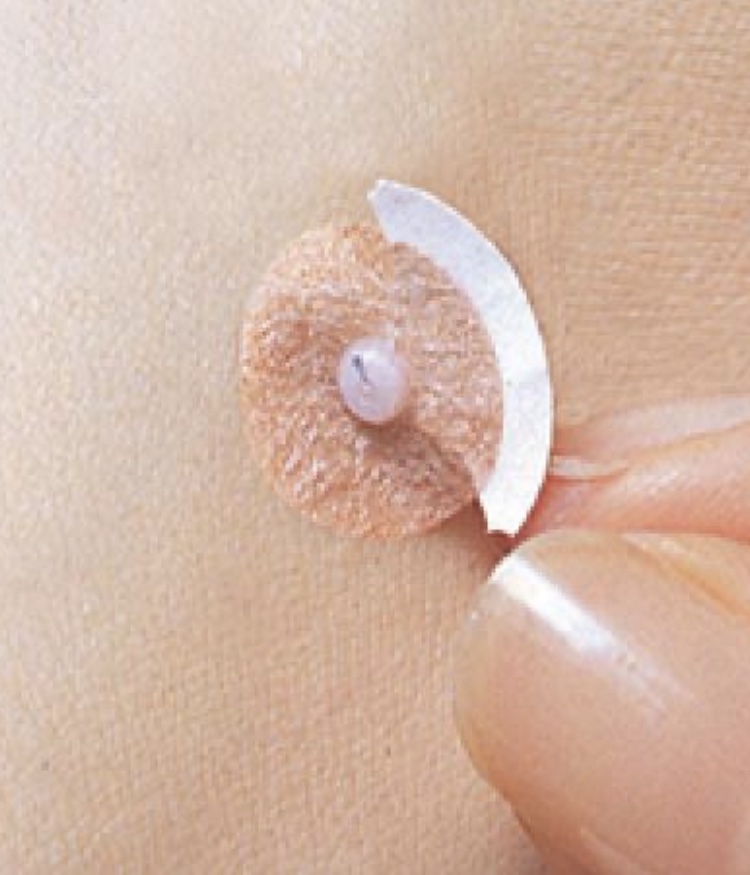 円皮鍼とは:絆創膏に数㎜の鍼が付いており主に圧痛のある部位や、硬くなった筋肉、ツボ、に貼り刺激を与え続ける治療法です。